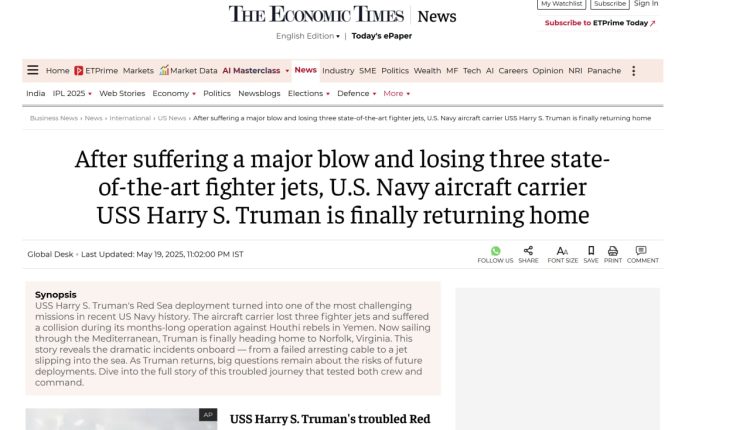 في تقرير تحليلي مطوّل حمل نبرة نقد لاذعة، كشفت مجلة The Economist البريطانية تفاصيل مثيرة ومقلقة عن مهمة حاملة الطائرات الأمريكية USS Harry S. Truman، التي انتهت مؤخرًا بخروجها من البحر الأحمر وانتقالها إلى المتوسط، بعد سلسلة من الحوادث التي وصفتها المجلة بأنها “أحد أكثر الفصول البحرية إثارة للجدل والفشل في تاريخ البحرية الأمريكية الحديث”.