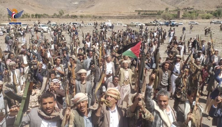 ورفع المشاركون في مسيرات راجلة ووقفات قبلية مسلحة غاضبة في عزل سعوان والرونة مديرية بني حشيش، وقروى مديرية جحانة وقروى العليا مديرية الطيال، وتوعر مديرية الحصن، وبني جرين وبني إسحاق مديرية صعفان، والمخلاف وضابي والمحيام والحطب والصوفة وبيت العليي والأعروش والربع مديرية الحيمة الخارجية، وغربي مسار مديرية مناخة، العلمين اليمني والفلسطيني وشعار البراءة من أعداء الله.