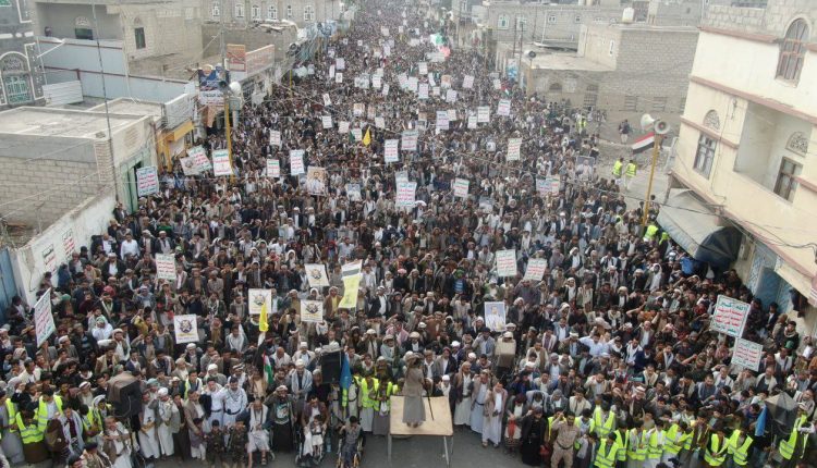 المشاركون رددوا الهتافات الرافضة للصمت العربي والدولي، والمنددة بجرائم الحرب التي يرتكبها الكيان الصهيوني بحق المدنيين، مؤكدين الجاهزية العالية للتحرك الميداني والفعلي إلى جانب القوات المسلحة اليمنية في معركة “الفتح الموعود والجهاد المقدس”.