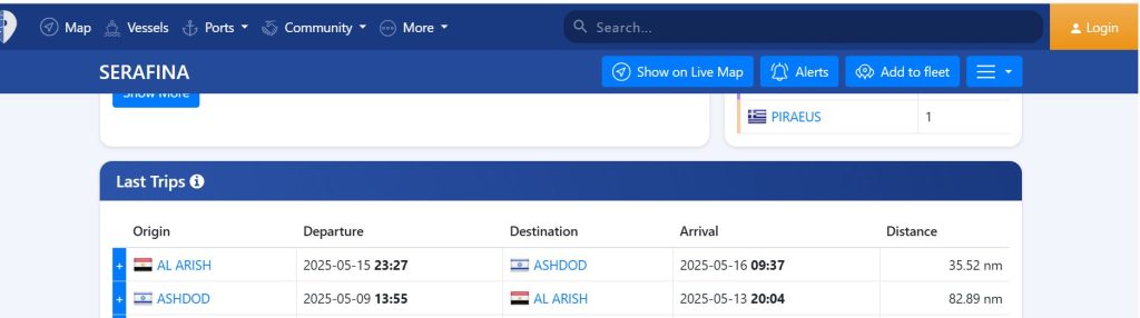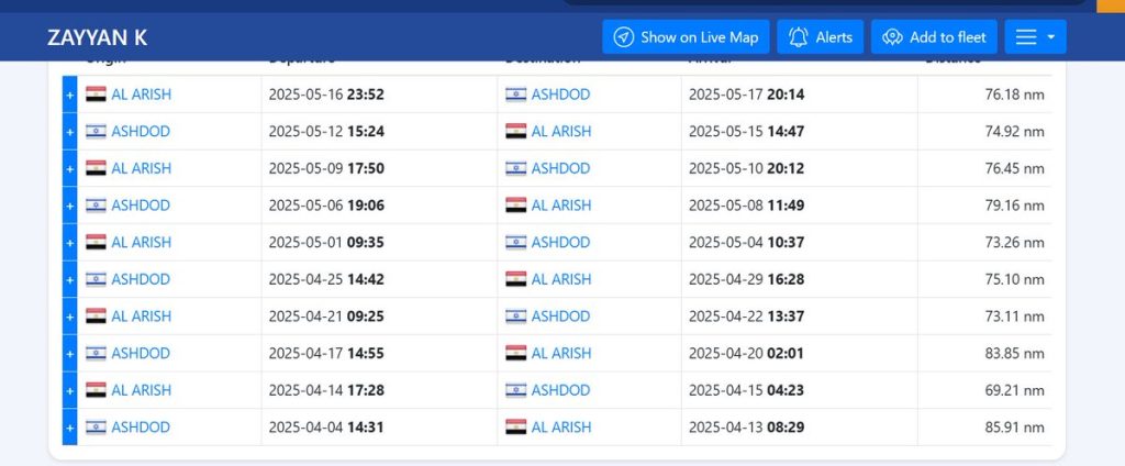 تظهر بياناتها في مواقع تتبع الملاحة أنها أجرت 8 رحلات بين موانئ مصر المحتلة وميناء أسدود، لكن هناك رحلات تم إغلاق أجهزة التعارف فيها كما يتبين، من الصورة المرفقة حيث هناك رحلات عودة من أسدود إلى موانئ مصر وليس هناك رحلات ذهاب بل يتم تسجيلها باسم أسدود -أسدود.