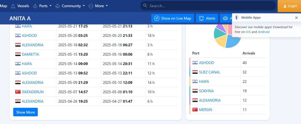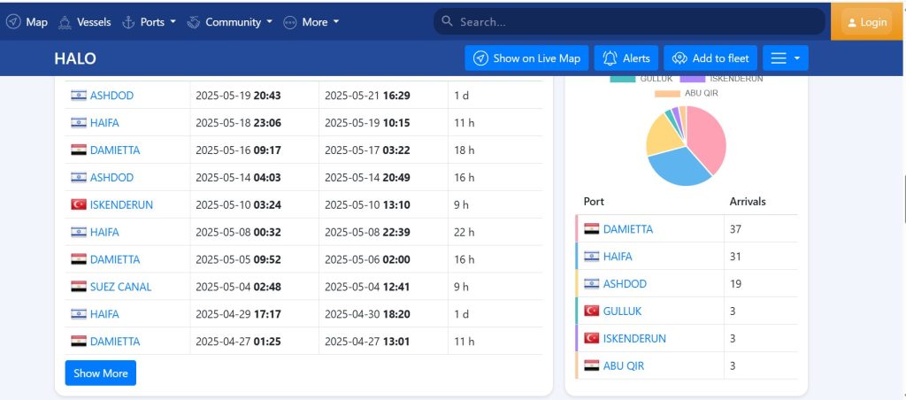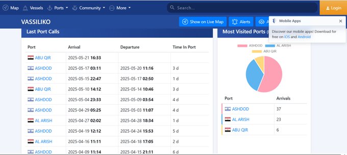 البيانات الظاهرة تبين أنها أجرت 64 رحلة إلى ميناء أسدود