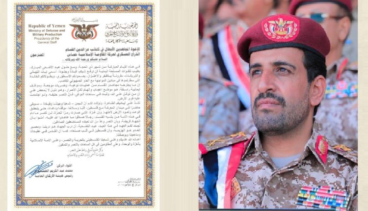 وجه رئيس هيئة الأركان العامة في القوات المسلحة اليمنية اللواء الركن محمد عبد الكريم الغماري رسالة مهمة إلى كتائب عز الدين القسام في المقاومة الفلسطينية الباسلة.