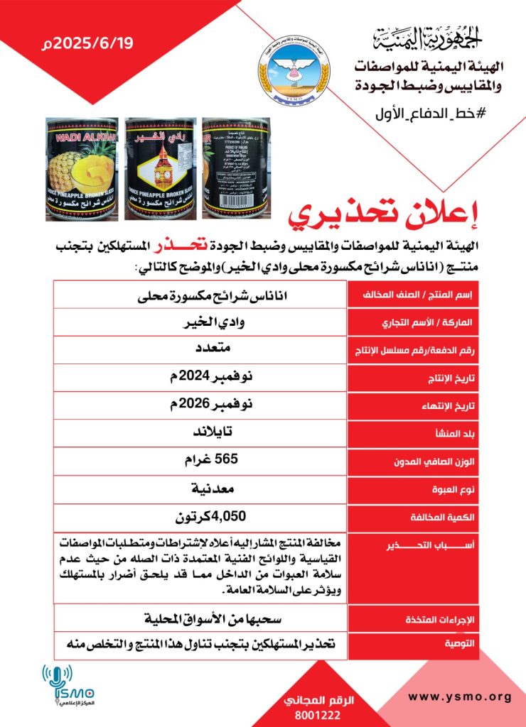 وأوضحت الهيئة في بيان رسمي أن منتج “أناناس شرائح مكسورة محلى” من ماركة “وادي الخير” والمصنّع في تايلند، لا يتطابق مع الاشتراطات الفنية والمعايير القياسية المعتمدة، نتيجة لوجود عيوب داخلية في العبوات قد تُعرض صحة المستهلكين للخطر.