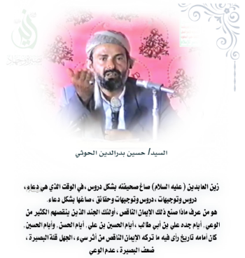 إن الحالة التي كان فيها حالة فعلاً شديدة، بالغة الشدة النفوس مقهورة ومهزومة والأفواه مكممة، لكن زين العابدين من أولئك الذين يفهمون بأن المجالات دائماً لا تغلق أمام دين الله فانطلق هو ليعلم ويربي، ويصنع الرجال؛ لأنه يعلم أنه إن كان زمانه غير مهيأ لعمل ما فإن الزمان يتغير فسيصنع رجالا للمستقبل، وصنع فعلاً وخرج الإمام زيد (عليه السلام) شاهراً سيفه في سبيل الله، وترك أمة ما تزال تسير على نهجه من ذلك اليوم إلى الآن)).