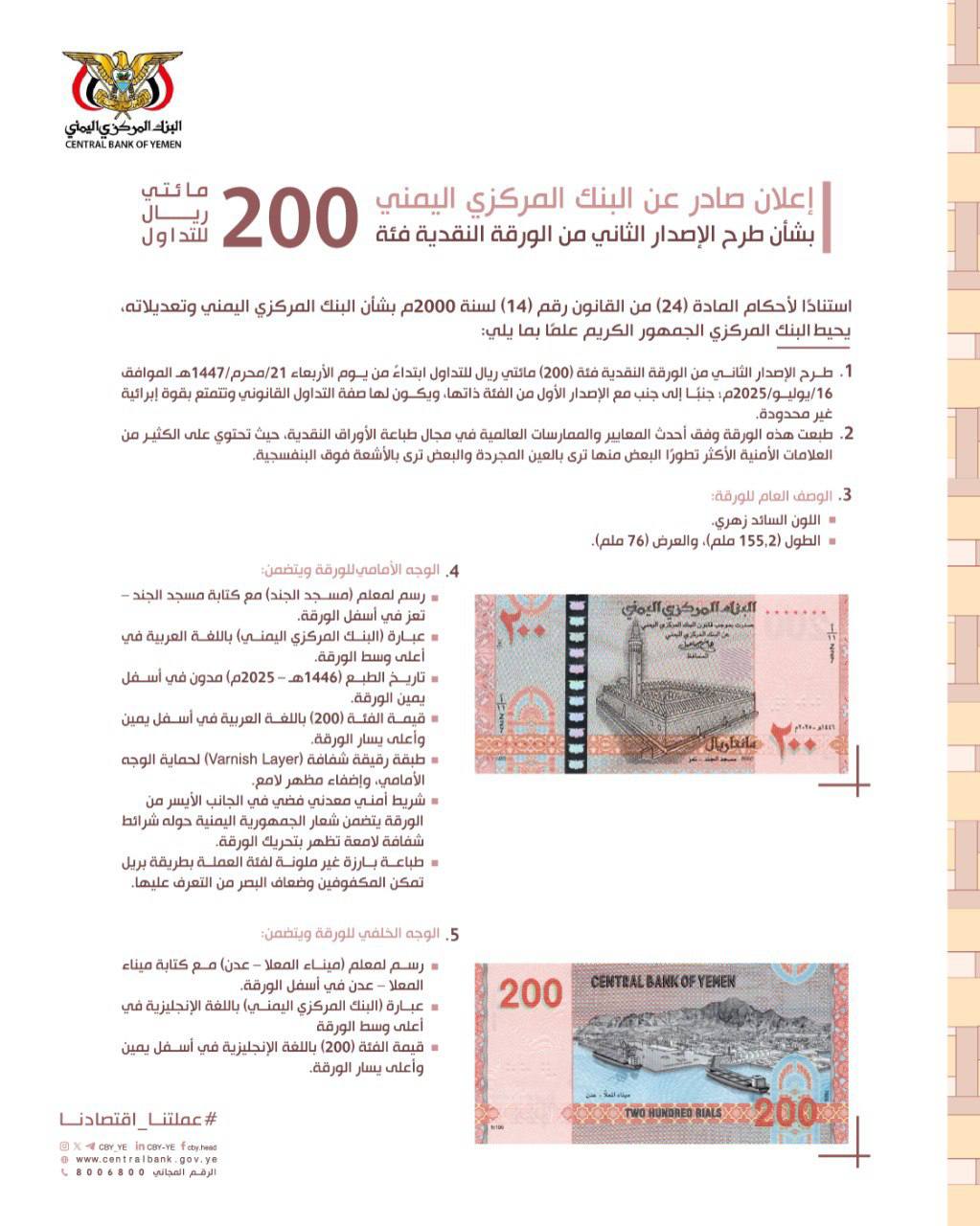 وفي خطوة وصفت بأنها نصر اقتصادي جديد، أعلن البنك المركزي اليمني بصنعاء عن طرح الإصدار الثاني من الورقة النقدية فئة ’’مائتي ريال’’ للتداول بدءًا من الأربعاء 16 يوليو 2025، ضمن خطة متكاملة لمعالجة مشاكل الأوراق النقدية التالفة دون التأثير على الكتلة النقدية أو سعر الصرف.