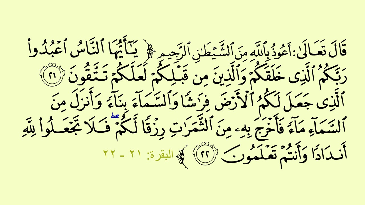 {يَا أَيُّهَا النَّاسُ اعْبُدُوا رَبَّكُمُ الَّذِي خَلَقَكُمْ وَالَّذِينَ مِنْ قَبْلِكُمْ لَعَلَّكُمْ تَتَّقُونَ الَّذِي جَعَلَ لَكُمُ الْأَرْضَ فِرَاشاً وَالسَّمَاءَ بِنَاءً وَأَنْزَلَ مِنَ السَّمَاءِ مَاءً فَأَخْرَجَ بِهِ مِنَ الثَّمَرَاتِ رِزْقاً لَكُمْ فَلا تَجْعَلُوا لِلَّهِ أَنْدَاداً وَأَنْتُمْ تَعْلَمُونَ}
