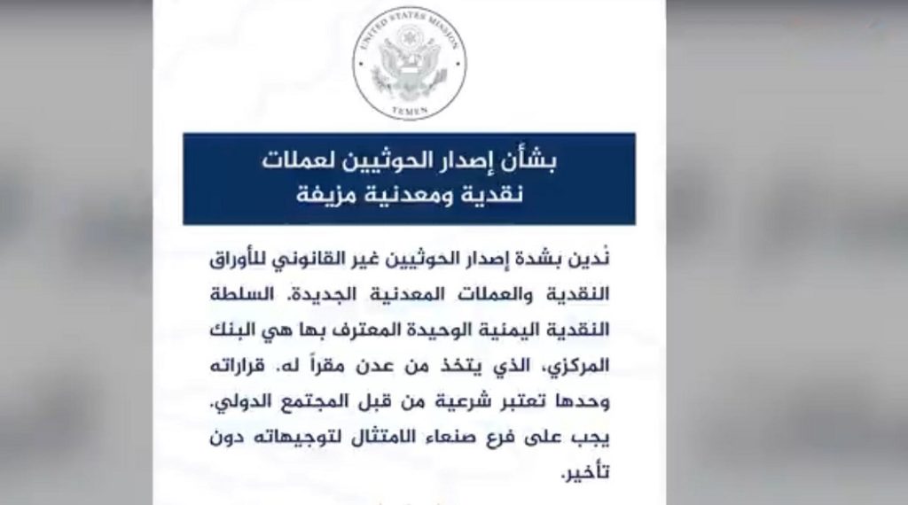 البيان الصادر عن السفارة الأمريكية في اليمن، والذي أعاد إلى الأذهان خطاب الهيمنة المالية الذي تمارسه واشنطن في البلدان الواقعة خارج دائرة تبعيتها، احتوى لهجة تهديدية واضحة. وضمن عباراته اللافتة، وردت دعوة إلى ما سمّته “التراجع الفوري ودون تأخير” عن طباعة العملة – وهي صيغة تمثل ذروة منطق الوصاية الاستعمارية الذي تحاول واشنطن فرضه على الشعب اليمني.