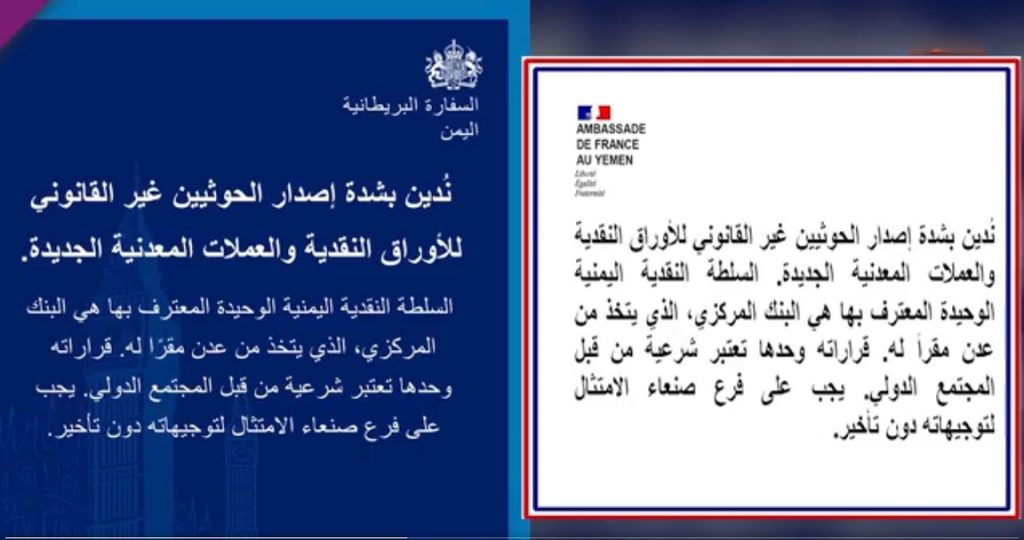 الإجراء الذي قوبل بارتياح في الأوساط الاقتصادية الحرة داخل اليمن، أثار في المقابل موجة انزعاج واضحة وصاخبة في العواصم الغربية المعادية لليمن، وفي مقدمتها واشنطن ولندن وباريس، حيث سارعت السفارات الغربية الثلاث إلى إصدار بيانات منفصلة – لكنها متطابقة من حيث اللغة والمضمون – تُدين هذه الخطوة، وتلمّح إلى تداعياتها الاقتصادية والسياسية.