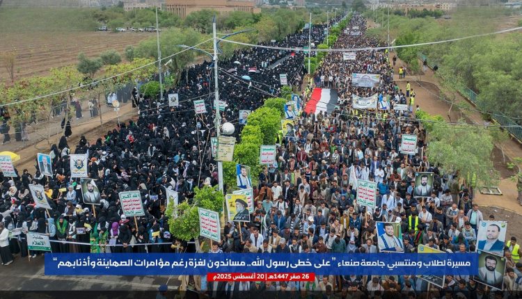 في قلب العاصمة، انطلقت المسيرة الطلابية الكبرى بجامعة صنعاء تحت شعار: “على خطى رسول الله، مساندون لغزة رغم مؤامرات الصهاينة وأذنابهم”.