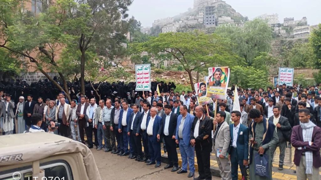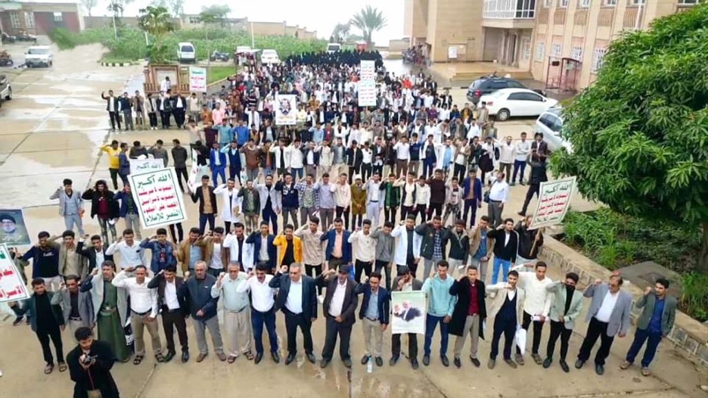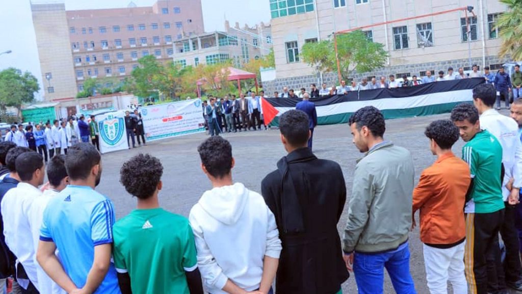 وفي المحويت، شهدت الجامعة مسيرة طلابية حاشدة رفع خلالها الطلاب العلمين اليمني والفلسطيني، وأدانوا جرائم العدو الصهيوني.
