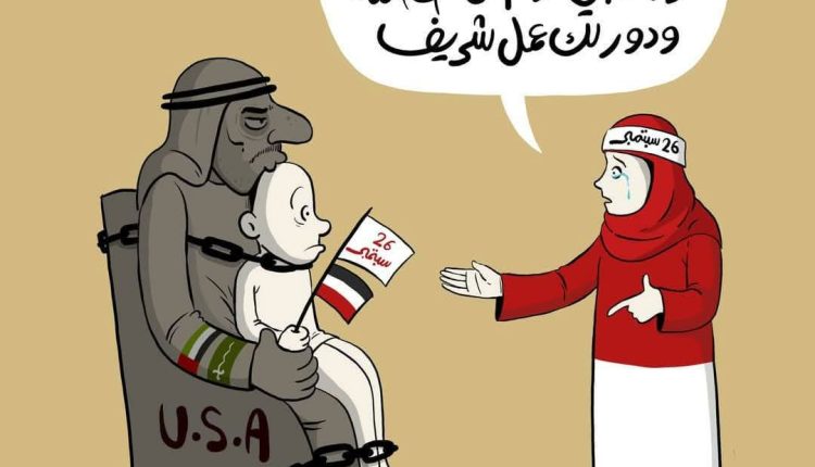 كاريكاتير معبر يجسد ثورة 26 سبتمبر كأم تخاطب أبنها العاق الذي يجلس في أحضان السعودية، تجسيد لمحاولات المرتزقة في تحويلها إلى محطة موسمية لبث سمومها السياسية والإعلامية وإثارة الفتنة :