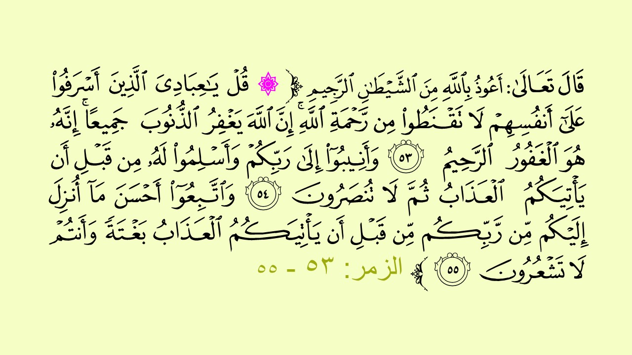 عند الوقوف أمام الآيات الكريمة من سورة الزمر، من الآية 53 إلى 55، نجد أنفسنا أمام خطاب إلهي هو من أبلغ وأرق ما ورد في كتاب الله من حيث الرحمة الإلهية والفتح الرباني لأبواب التوبة، والذي تناول الشهيد القائد حسين بدر الدين الحوثي تحليله بأسلوب فكري، تربوي، إحيائي، يلامس فيه أعمق ما في النفس البشرية من صراعات بين اليأس والرجاء، بين القنوط والطمع في رحمة الله، قال تعالى : [قُلْ يَا عِبَادِيَ الَّذِينَ أَسْرَفُوا عَلَى أَنْفُسِهِمْ لَا تَقْنَطُوا مِنْ رَحْمَةِ اللهِ إِنَّ اللهَ يَغْفِرُ الذُّنُوبَ جَمِيعًا إِنَّهُ هُوَ الْغَفُورُ الرَّحِيمُ (53) وَأَنِيبُوا إِلَى رَبِّكُمْ وَأَسْلِـمُوا لَهُ مِنْ قَبْلِ أَنْ يَأْتِيَكُمُ الْعَذَابُ ثُمَّ لَا تُنْصَرُونَ (54) وَاتَّبِعُوا أَحْسَنَ مَا أُنْزِلَ إِلَيْكُمْ مِنْ رَبِّكُمْ مِنْ قَبْلِ أَنْ يَأْتِيَكُمُ الْعَذَابُ بَغْتَةً وَأَنْتُمْ لَا تَشْعُرُونَ (55) ] من سورة الزمر