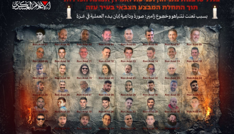 نشرت كتائب الشهيد عز الدين القسّام، الجناح العسكري لحركة المقاومة الإسلامية حماس، عبر قناتها على تطبيق “تلغرام”، اليوم السبت، منشوراً يتضمّن صورة لـ46 أسيراً إسرائيلياً في قطاع غزة، بين حيّ وقتيل، وأرفقته بعبارة: “بسبب تعنّت نتنياهو وخضوع زامير؛ صورة وداعية إبّان بدء العملية في غزة”.