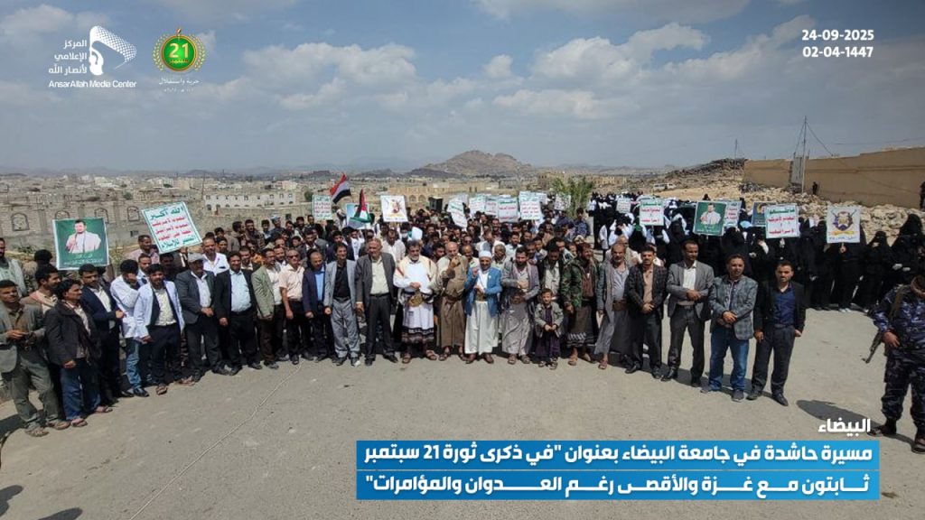 جامعة البيضاء بدورها شهدت مسيرة طلابية كبيرة بحضور المحافظ وعدد من قيادات المحافظة والجامعة، حيث ارتفعت الأعلام اليمنية والفلسطينية مع هتافات تشدد على أن ثورة 21 سبتمبر