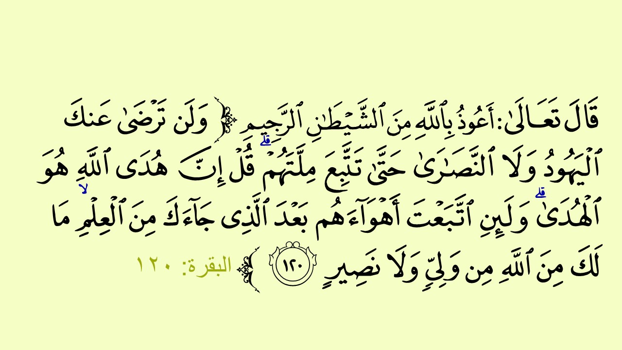 يؤكد الشهيد القائد أن الآية الكريمة تحوي تصريحاً إلهياً قاطعاً لا لبس فيه، يبدأ بـــ لن ، النافية المؤبدة، ليؤكد أن رضا اليهود والنصارى عن المسلمين محالٌ أن يتحقق ما لم يتنازل المسلم عن دينه ويذوب في ملتهم، لن يرضوا عنك أبداً، مهما عملت لهم، مهما قدمت لهم، مهما أظهرت من حسن نوايا معهم .. حتى تتبع ملتهم.