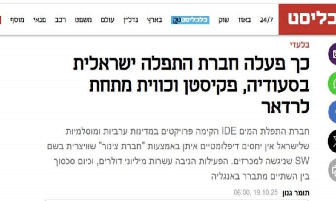 كشفت تحقيقات صحفية أن شركة إسرائيلية متخصصة في تحلية المياه تُدعى “IDE” نجحت خلال العقد الماضي في اختراق أسواق عدة دول عربية وإسلامية، من بينها السعودية والكويت وباكستان، محققة مئات الملايين من الدولارات، عبر آلية تمويهية تعتمد على شركة وسيطة مقرّها سويسرا تُدعى “Swiss Water”.