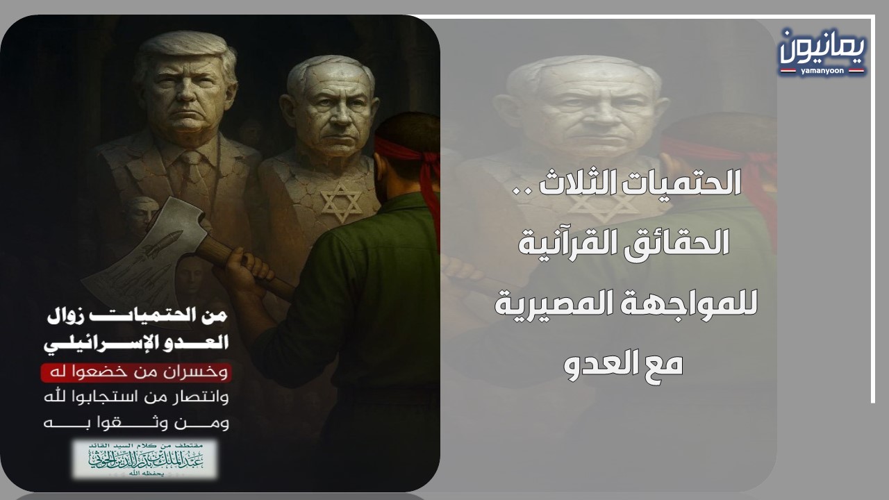 أكد السيد القائد يحفظه الله ، على قاعدة إيمانية راسخة، أن الصراع مع العدو الإسرائيلي ليس مجرد خلاف سياسي أو صراع جغرافي، بل معركة بين الحق والباطل، بين من استجابوا لله، ومن تولّوا أعداءه، وفي قلب هذه الرؤية، ترتكز ثلاث حتميات قرآنية يرى السيد القائد أنها ليست فقط وعوداً ربانية، بل سنناً إلهية لا تتخلف، مهما طال الزمن، أو اشتدت المؤامرات.