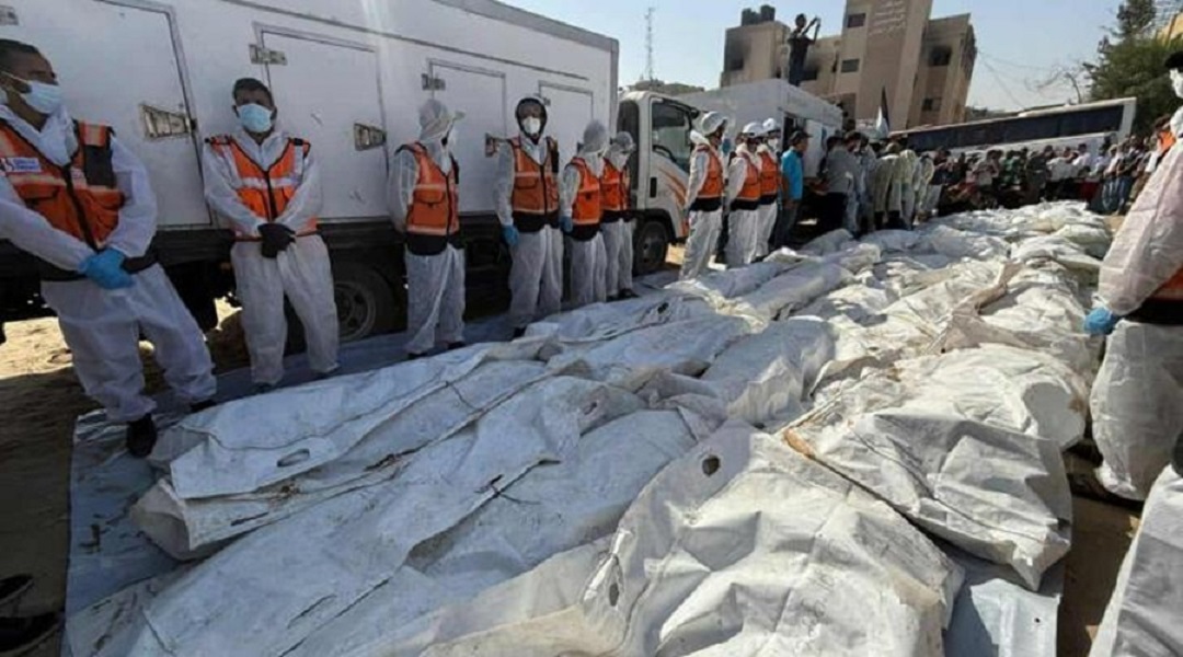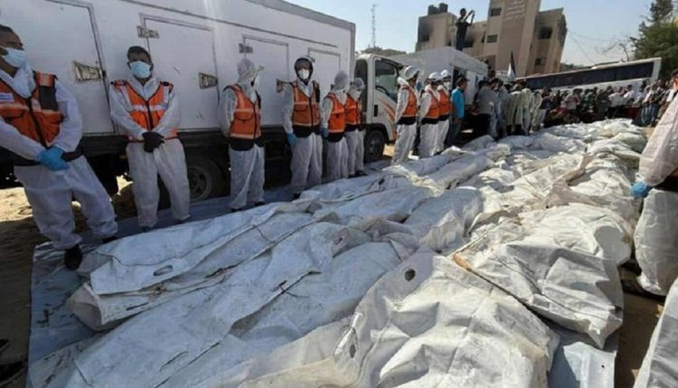 في الوقت نفسه، تم دفن 54 فلسطينيًّا مجهولي الهوية في مقبرة جماعية بدير البلح وسط قطاع غزة، بعد أن عجزت العائلات والطواقم الطبية عن التعرف على هوياتهم جراء آثار التعذيب المروعة.