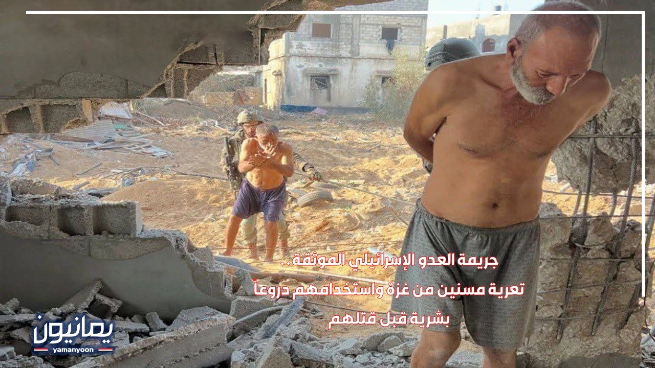 في واحدة من أبشع الجرائم التي ارتكبها العدو الإسرائيلي ضد المدنيين من أبناء غزة تضاف إلى سجله الدموي، كشفت صور وشهادات موثقة عن جريمة حرب صريحة متكاملة الأركان تتضمن اعتقال وتعرية مسنين من أبناء غزة واستخدامهم كدروع بشرية قبل قتلهم بدم بارد, هذه الجريمة التي وثقتها وسائل إعلام إسرائيلية نفسها تعكس مستويات جديدة من الوحشية والاستهتار بحقوق الإنسان والقانون الدولي, ما يؤكد صوابية المواجهة والاستعداد والجهاد والإسناد لمحور القدس والمقاومة ومواقفه المشرفة في مواجهة العدو وكبح جرائمه واستباحته في زمن النفاق العالمي حيث لا صوت يعلو فيه غير صوت البندقية والصاروخ.