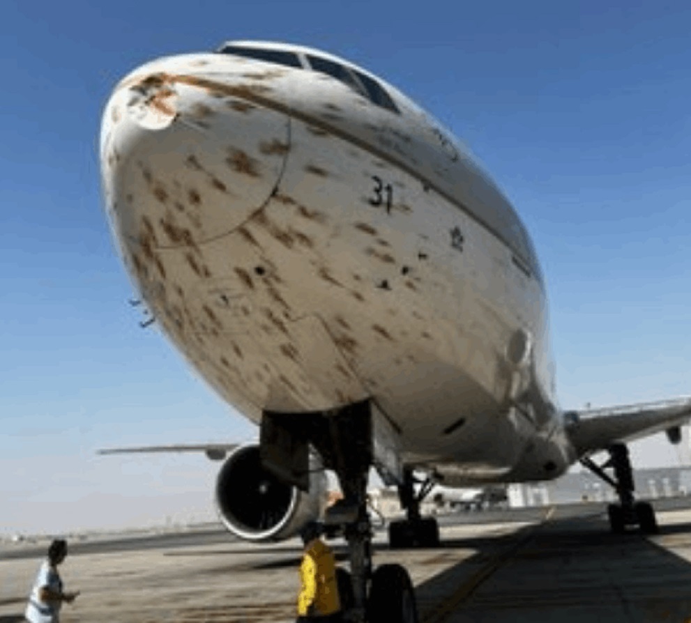 ورغم الاصطدام الذي تعرضت له، هبطت الطائرة بسلام، لكن تضرر الجزء العلوي منها، بما في ذلك الرادوم (غطاء الهوائي للرادار)، الذي يُستخدم لحماية الرادار من العوامل البيئية مثل الأمطار والرياح والجليد، مع السماح في الوقت نفسه بمرور الإشارات اللاسلكية.