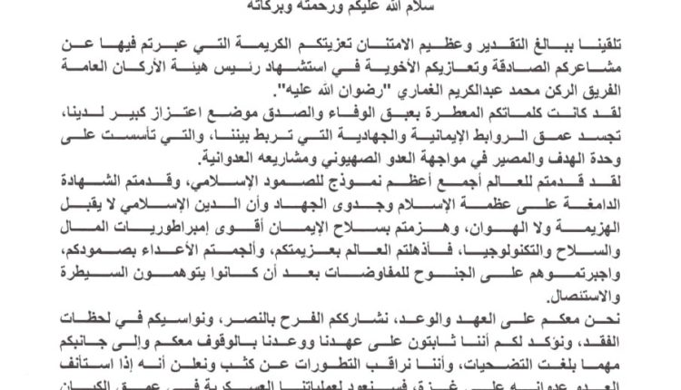 اختار اللواء المداني أن يصوغ رسالته بلغةٍ تستمد قوتها من روح الإيمان والتضحية، وبد افتتاحها بالحمد لله الذي أكرمنا بالجهاد وشرفنا بالاستشهاد، بدا الخطاب مفعمًا بمعاني الصبر والثبات واليقين بالنصر، لم يكن نص الرسالة مجرد تكرار لعبارات التعزية، بل إعلانًا إيمانياً بأن الشهادة لا تعني نهاية المسيرة بل استمراريتها في وجه العدو.