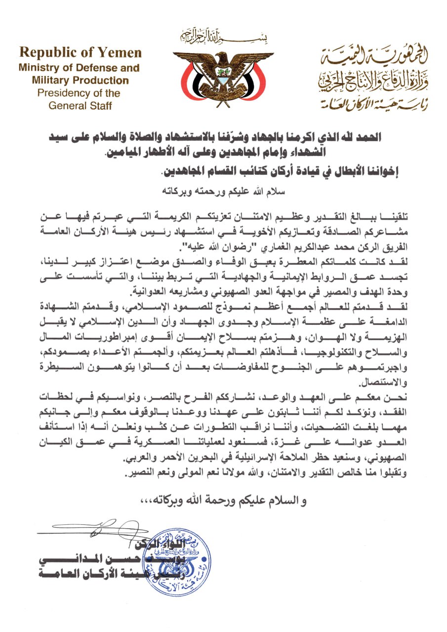 في خضم المتغيرات الإقليمية المتسارعة وفي مشهد امتزجت فيه الدماء بين غزة وصنعاء ، جاءت رسالة رئيس هيئة الأركان العامة اللواء يوسف حسن المداني إلى قيادة كتائب القسام لتشكّل حدثًا سياسيًا وعقائديًا وعسكريًا يتجاوز إطار المراسلات الرسمية بين شركاء المقاومة ورفاق السلاح، الرسالة، التي حملت في ظاهرها عبارات شكر على تعاز برحيل الشهيد القائد، الفريق محمد عبد الكريم الغماري، انطوت في جوهرها على بيان موقف إستراتيجي عميق يعبّر عن وحدة المصير بين اليمن وفلسطين، وعن إيمانٍ راسخ بأن الجراح لا تُضعف الموقف، بل تُعمّقه وتُثبّته.