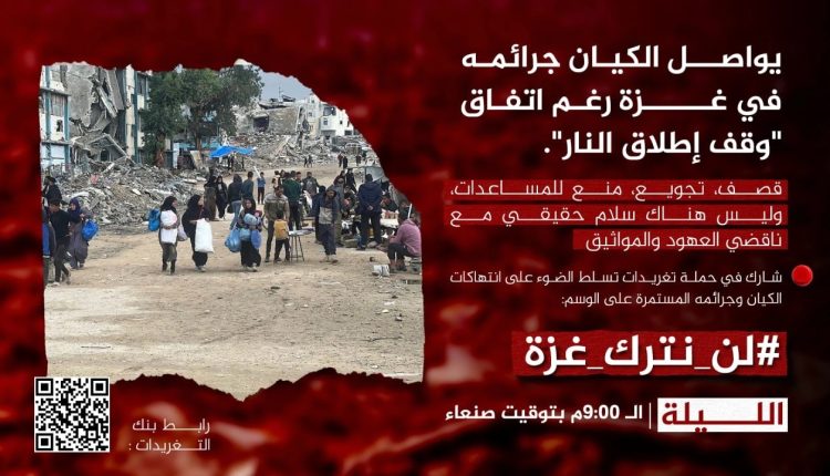 تنطلق عند التاسعة من مساء اليوم حملة تغريدات على منصة إكس، للتنديد باستمرار انتهاكات وجرائم الاحتلال في غزة رغم اتفاق وقف إطلاق النار، وأوضح منظِّمو الحملة أن الهدف منها كشف ممارسات الاحتلال، المدعوم من الولايات المتحدة والغرب، وتسليط الضوء على الخروقات المستمرة للاتفاق.