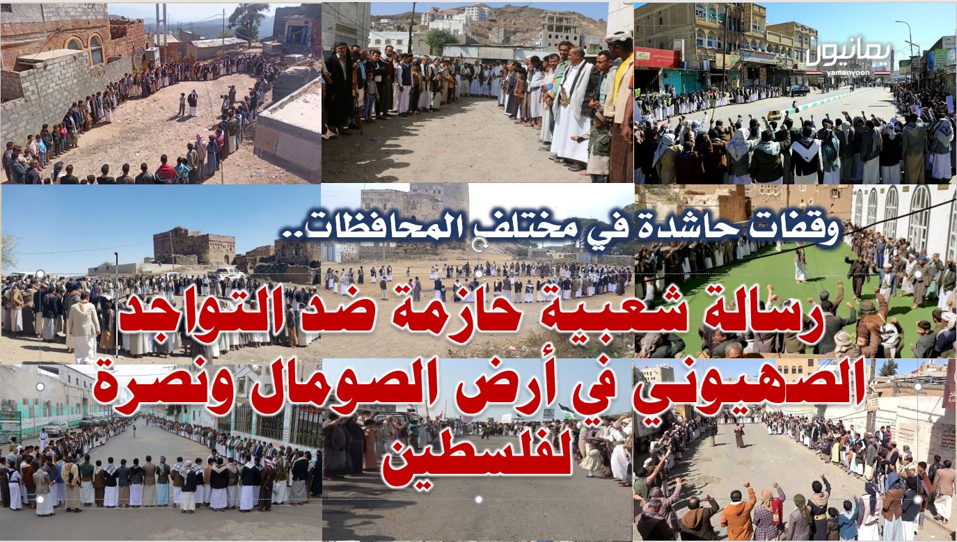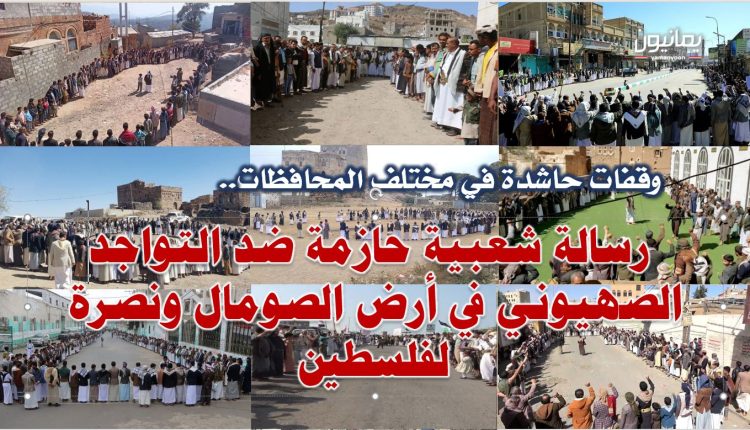 وفي محافظة تعز، خرجت وقفات احتجاجية نددت باستمرار الجرائم الصهيونية بحق الشعب الفلسطيني، ورفضت اعتراف العدو بإقليم “أرض الصومال”، معتبرة ذلك حلقة جديدة في مسلسل المؤامرات الصهيونية التي تستهدف المنطقة.