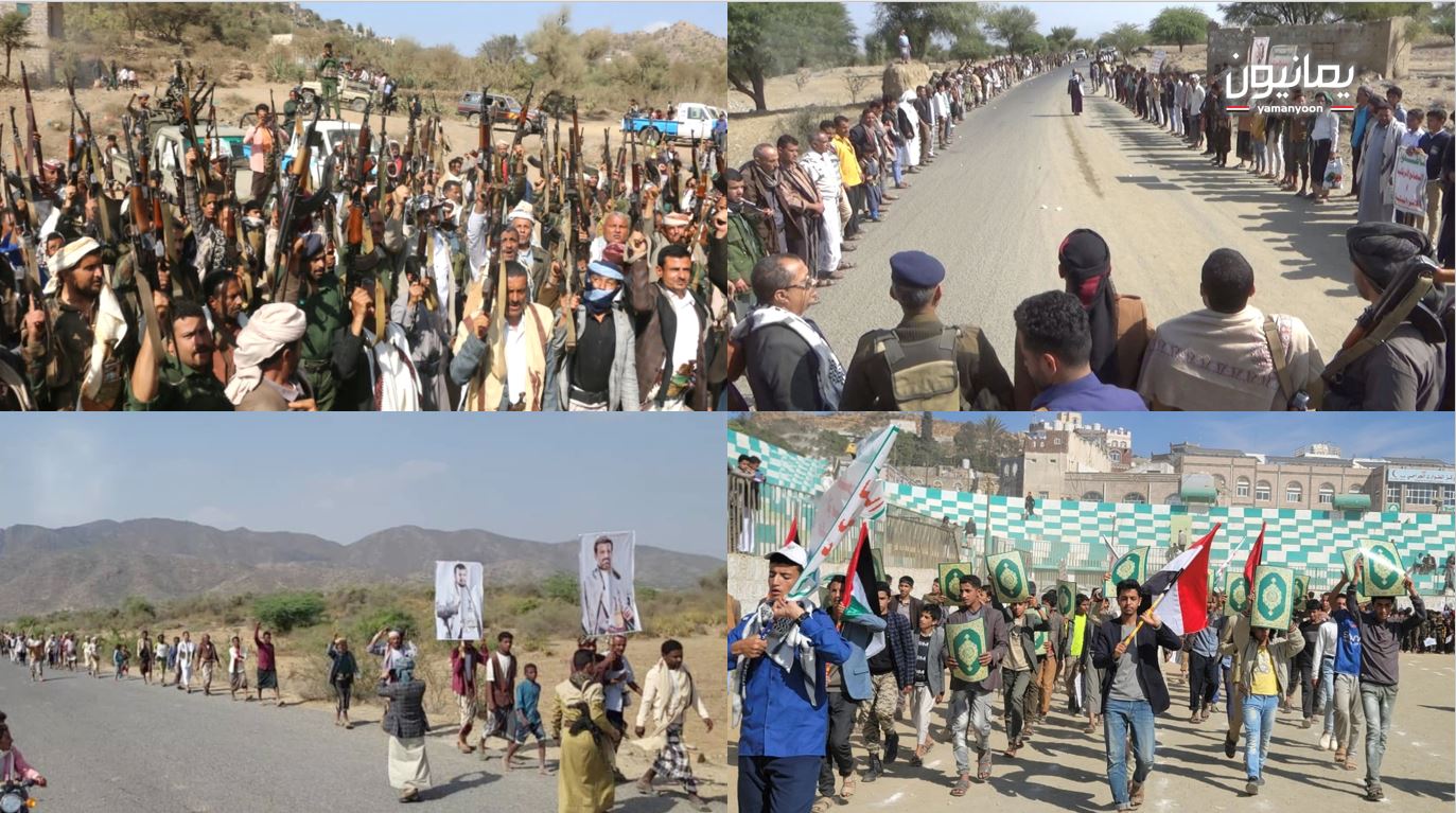 وفي محافظة ريمة، نظّم أبناء عزلة الحوادل بمديرية الجعفرية وقفة قبلية ومسيرًا راجلًا إعلانًا للجهوزية العالية والنفير في مواجهة الأعداء ومواصلة إسناد غزة، رددوا فيه هتافات الصمود والاستعداد للتضحية في سبيل الله والدفاع عن المستضعفين، مؤكدين استمرار مساندة خيارات الردع العسكري ضد الكيان الصهيوني حتى تتوقف جرائمه في غزة، وجدّدوا العهد والوفاء لمؤسس المسيرة القرآنية الشهيد القائد السيد حسين بدرالدين الحوثي بالسير على دربه في مواجهة غطرسة أمريكا والكيان الصهيوني وأدواتهم من العملاء.