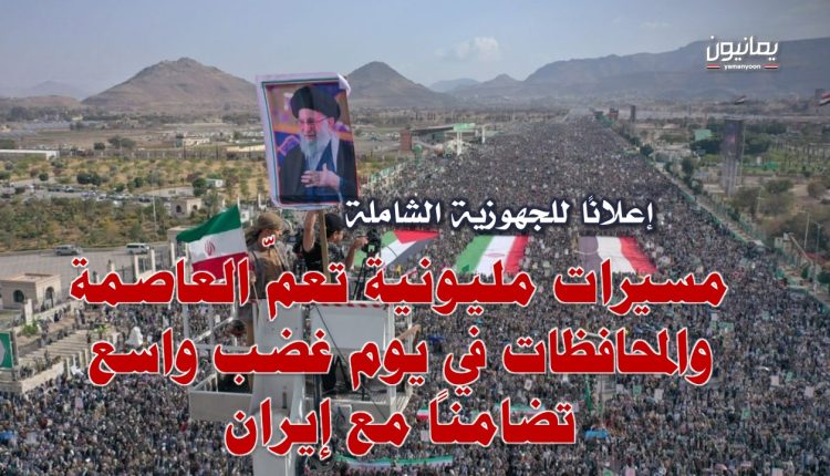 إعلانا للجهوزية الشاملة .. مسيرات مليونية تعمّ العاصمة والمحافظات في يوم غضب واسع تضامنًا مع إيران