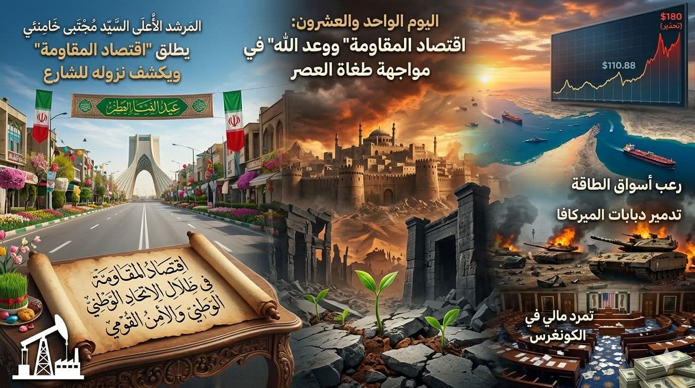 ندخل اليوم الواحد والعشرين من الحرب، متزامناً مع حلول العام الإيراني الجديد (1405 هـ.ش) وعيد النوروز وعيد الفطر السعيد. في هذه اللحظة المفصلية، حيث تقف المنطقة على حافة الهاوية بعد ليلة القنابل الخارقة للتحصينات والتخبط الأمريكي، أطل المرشد الأعلى الجديد السيد مجتبى خامنئي ببيان شامل يمزج بين البعد العقائدي، الشفافية السياسية، والتخطيط الاقتصادي.