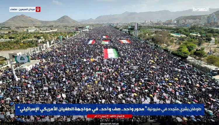شهدت أمانة العاصمة صنعاء والمحافظات اليمنية الحرة مسيرات مليونية حاشدة، تحت شعار “محور واحد صف واحد في مواجهة الطغيان الأمريكي الإسرائيلي” ، وذلك في سياق الموقف اليمني الشعبي المساند لقضايا الامة ومواجهة العدوان على إيران ولبنان وغزة، وقد أصدرت هذه المسيرات بيانًا جامعًا عكس مواقفها تجاه التطورات الراهنة، مؤكدة على رؤية موحدة لمواجهة الهيمنة الأمريكية والصهيونية في المنطقة.