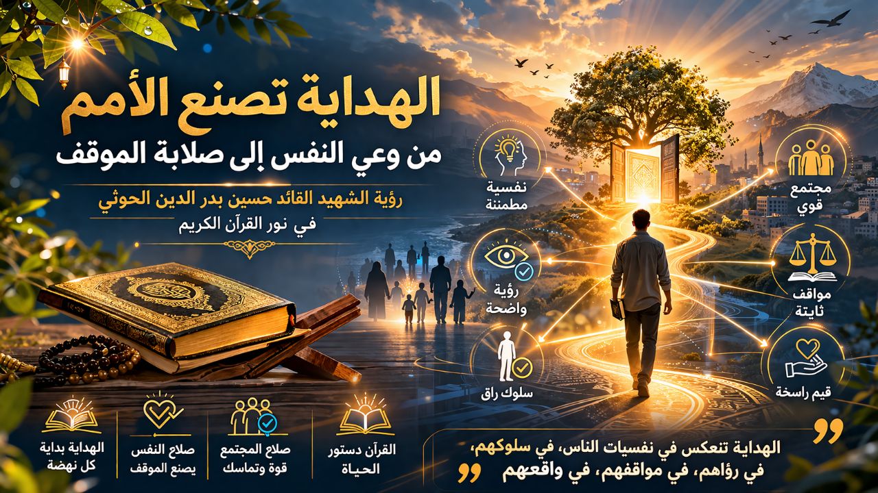 تكشف رؤية الشهيد القائد حسين بدر الدين الحوثي أن الهداية ليست مجرد مفهوم تعبدي، بل مشروع نهوض شامل يبدأ من النفس وينتهي ببناء الأمة، فحين تنعكس الهداية في نفسيات الناس وسلوكهم ورؤاهم، فإنها تصنع مجتمعًا قويًا، واعيًا، حكيمًا، قادرًا على حمل رسالته التاريخية، إنها معادلة واضحة ، فصلاح النفس وصلاح الموقف ينتج عنه صلاح الأمة، وهي الرؤية التي تجعل القرآن حاضرًا في الواقع، فاعلًا في صناعة الوعي، ومؤثرًا في مسار الأحداث.