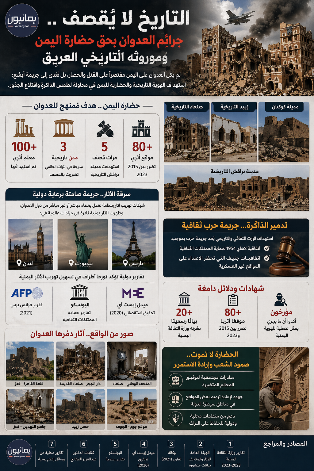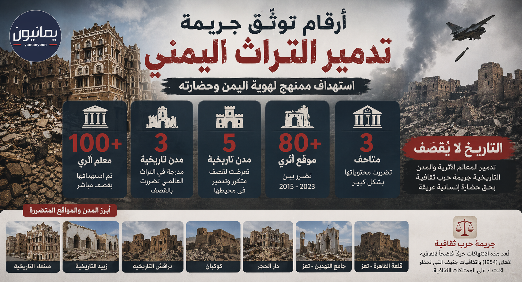 إن استهداف الإرث الثقافي والتاريخي لأي أمة يُعد جريمة حرب بموجب اتفاقية لاهاي لحماية الممتلكات الثقافية (1954)، واتفاقيات جنيف التي تحظر الاعتداء على المواقع غير العسكرية. ومع ذلك، فإن تحالف العدوان لم يكتفِ بالحصار والتجويع، بل امتد ليضرب في عمق ما يُمثل روح اليمن وكرامته التاريخية.