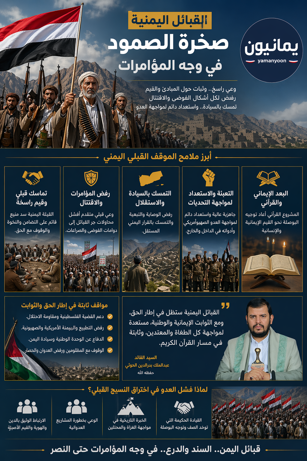 ما يميز مواقف القبائل اليمنية في هذه المرحلة هو ارتباطها ببعد إيماني وأخلاقي، يعزز من ثباتها ويمنحها دافعًا معنويًا قويًا، وقد لعب المشروع القرآني دورًا عظيما في إعادة توجيه البوصلة لدى كثير من أبناء القبائل، نحو التمسك بالقيم الدينية والإنسانية في مواجهة التحديات، بقيادة حكيمة من السيد القائد عبدالملك بدرالدين الحوثي حفظه الله، باعتبارها أحد العوامل التي أسهمت في ترسيخ هذا الخطاب وتعزيز حالة الوعي العام.