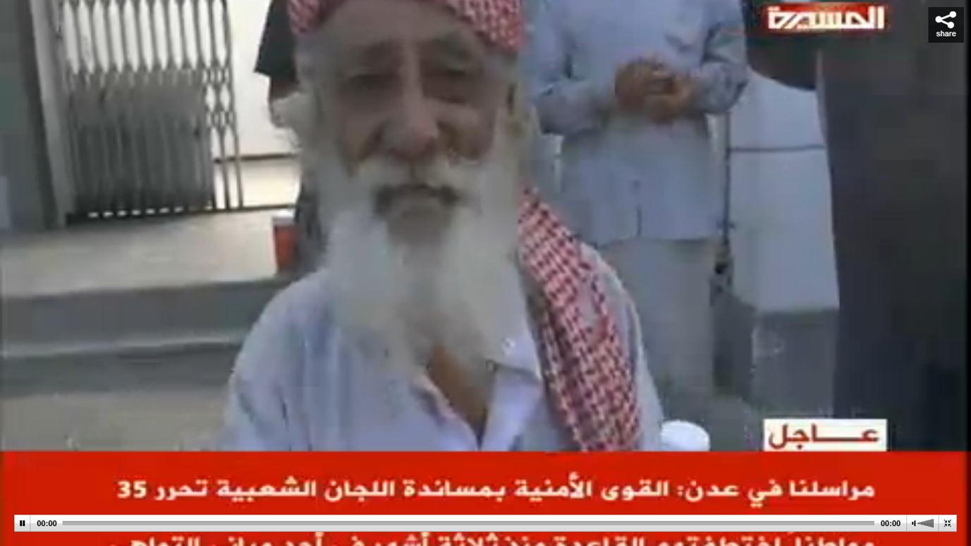 وأكد شيخ مسن ” مرفق صورته ” أن عناصر القاعدة اختطفوه من احد الفنادق لمجرد انه احتج على تكسيرهم لزجاج الفندق مؤكداً قيامهم بسرقة محفظته وامواله وبطائقه وهاتفه الموبايل .