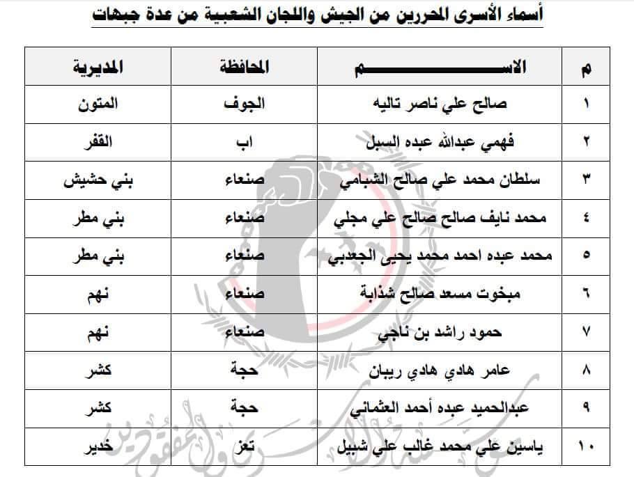 وفيما يلي أسماء المفرج عنهم من أسرى أبطال الجيش واللجان الشعبية: