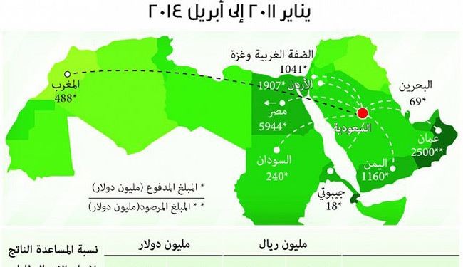 وبحسب صحيفة العدوان فانة ووفقاً لتقديرات خبراء صندوق النقد الدولي، تأتي مصر في مقدمة هذه الدول حيث بلغ إجمالي الاموال التي رصدت لها 24.4 مليار ريال (6.5 مليار دولار) خلال الفترة من يناير 2011 إلى أبريل 2014 .