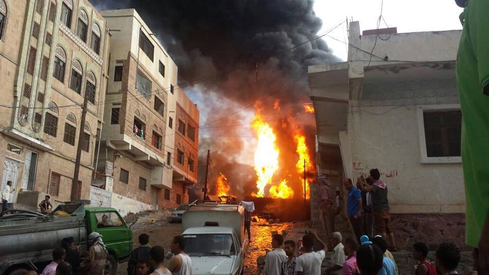جريمة مروعة ترتكبها عناصر القاعدة والإصلاح بتعز تفجير قاطرة نفط وسط احياء سكنية ومقتل 14 مواطن واحتراق المنازل