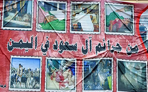وتحوي اللافتات مشاهد لبشعة الجرائم التي ارتكبها العدوان السعودي الامريكي بحق المئات من النساء والاطفال وتعريف الراي العام بحقيقة جرائم آل سعود .