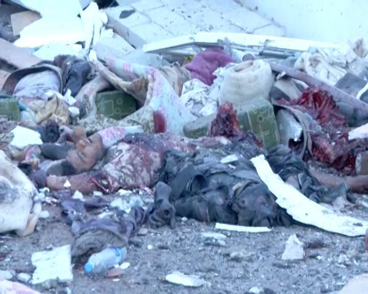وتظهر في الصور وحشية الجريمة التي ارتكبها طيران العدوان السعودي الأمريكي في المنطقة ، حيث تناثرت أشلاء الضحايا بين الانقاض.