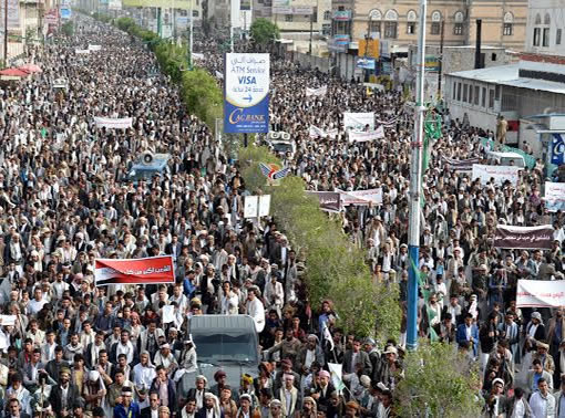 وجدد أبناء الشعب اليمني في البيان الصادر عن المسيرة الجماهيرية الحاشدة التي خرجت اليوم بصنعاء تحت شعار “معا ضد العدوان” تأكيدهم الرافض لهذا العدوان الهمجي البربري الذي تقوده السعودية والحصار الخانق والجائر على اليمن .. مؤكدين مضيهم وبكل قوه التعبئة العامة لمواجهة العدوان السعودي الامريكي بكل السبل والوسائل المتاحة.