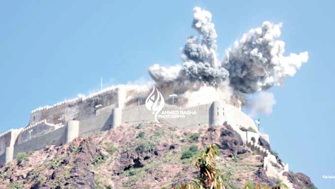صواريخ العدوان تنتهك حرمة قلعة القاهرة بتعز .. وتواصل غيها في صعدة التاريخية